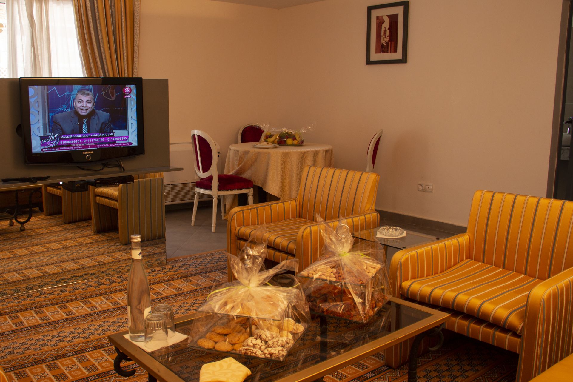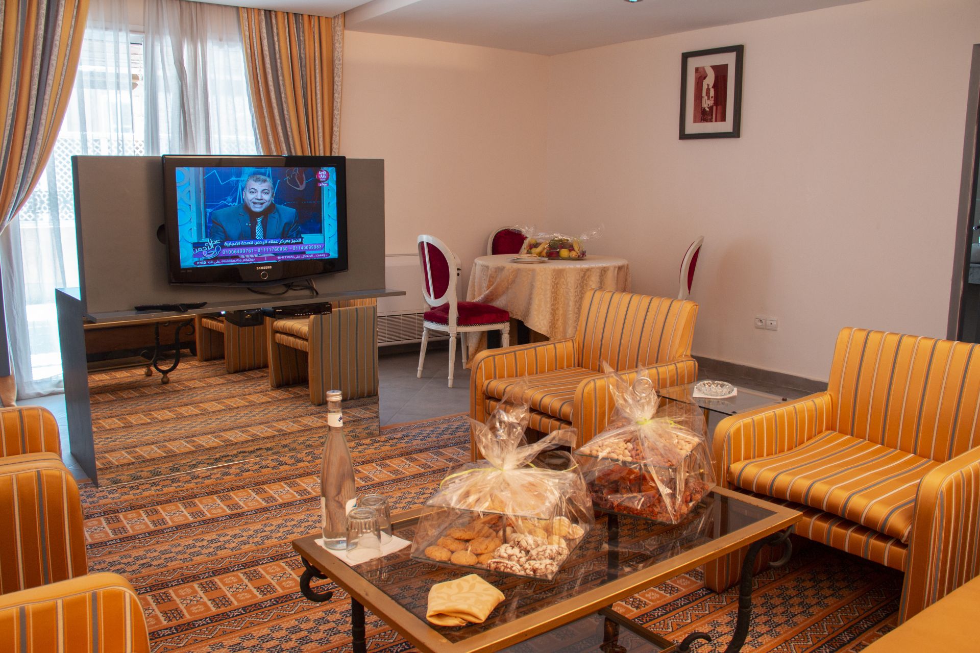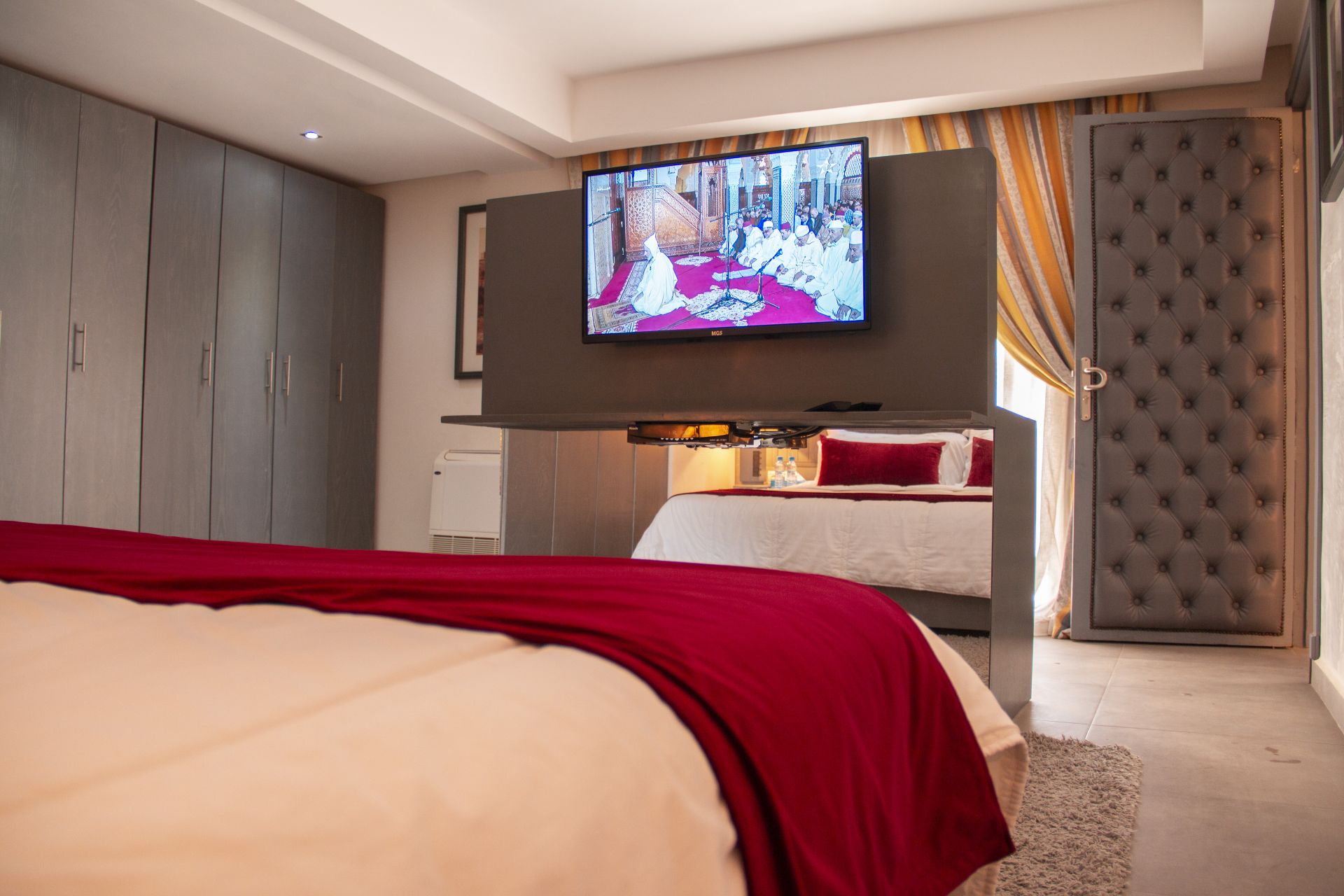 Confort : armoire-mini bar- TV satelitte- toilettes-Douche double avec toutes les commodités et TV-réfrigérateur-Séjour avec canapé pour deux personnes ou plus-table à manger-Terrasse avec coin salon pour plusieurs personnes- conditionnement- prise de chevet-téléphone- Balcon- Bureau- chauffage.